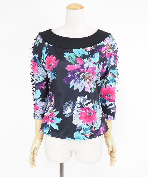 オーガンジーフリルフレアスカート ブラック ピンク系柄 【社交ダンス 衣装 スカート】